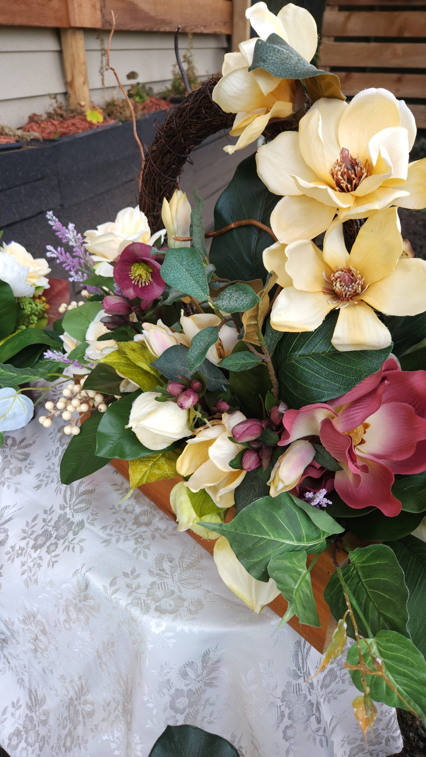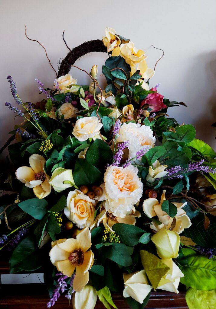 Our latest arrangement features striking cream magnolias and sunny yellow roses, grounded by the moody depth of burgundy hellebore. With delicate sprigs of purple lavender and white seeds tucked into lush Chinese lantern foliage, it’s a masterclass in seasonal charm. This set is the perfect complement to a Celebration of Life.